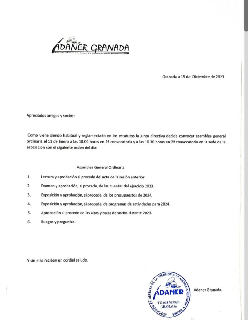 Os informamos que el próximo 11 de enero de 2024 tendrá lugar nuestra Asamblea General Ordinaria en la sede de ADANER Granada. A las 10:00h en 1ª convocatoria y a las 10:30h en 2ª convocatoria.